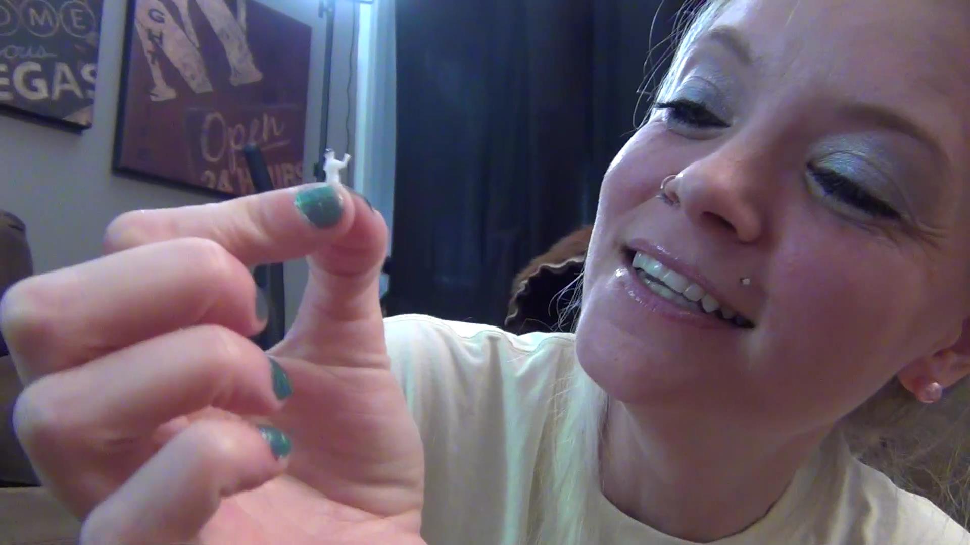 Makayla comes walking in from her neighbors party they just had! Makayla found a cute guy there but he kept blowing her off and didn't seem interested in her but Makayla was crushing hard on him! So since he was being a ass, she has shrunk him down and brought him home with her! Makayla then proceeds to torture him, putting him in between her stinky toes, putting him in her mouth and even placing him in her sweaty stockings making him cum against his will! After so much fun with him, she thinks she might get in trouble doing this so now she has to get rid of him someway somehow! Watch what Makayla does to her little crush that didn't have nothing to do with her at the party! How is she going to end him?!