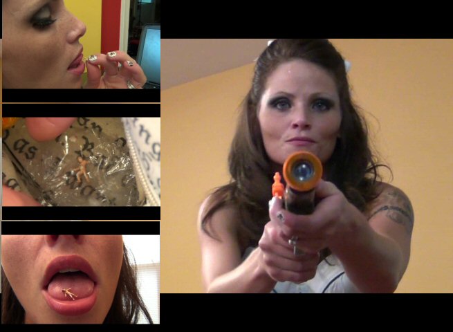 Misty is so excited, she got an envelope in the mail, containing tiny shrunken men. She pulls 4 puny men out. Telling them she's going to use them as toe spreaders. She inserts them between her sweaty toes while talking sweet to them. She begins to paint her giant toes, letting them know this will be there new place in life as her human toe spreaders. She tells them if there good, and they don't try to escape, she'll reward them! Ones caught escaping, will live between her toes in her sweaty flats.