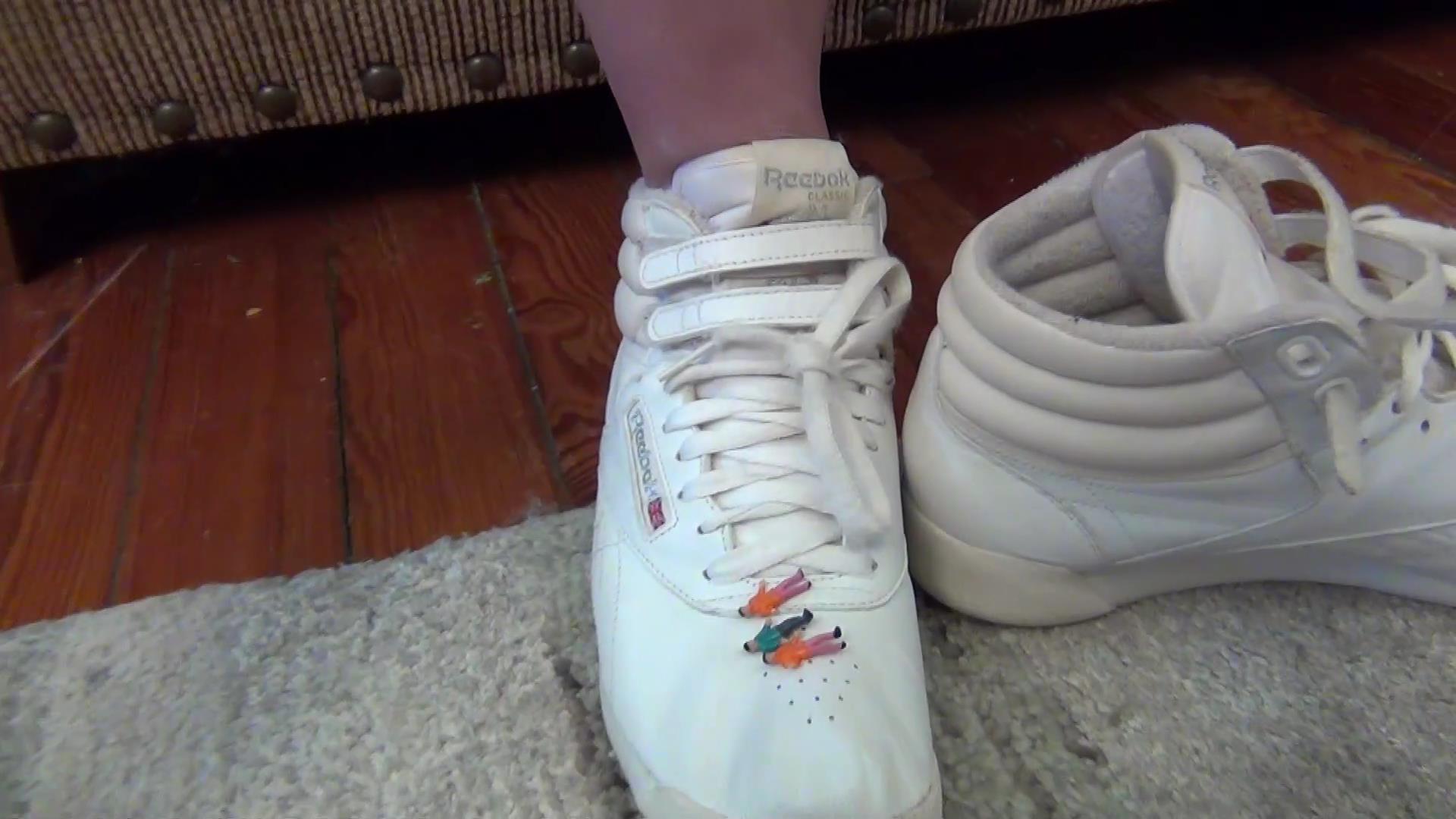 Addy comes inside the house and starts shouting out to her friends but theirs no response as she accidentally steps on a few that are shrunken very tiny! Addy sits down as she starts taking off her sneakers with no socks and grabs her phone. She makes a phone call to her friend which is the shrunken peoples sisters which are her tiny shrunken brothers. Addy tells her she has no idea where they are but she's ready to get together and workout! She then gets up and starts working out by herself as the tiny shrunken brothers climb up to her stinky sneakers, and climbs inside since there warm and cozy but highly stinky, at least there safe though! Addy continues her workout but suddenly decides to put her sneakers back on, as she looks down she cant believe what she is seeing. She tells them that there sister has been looking for them! Addy takes them out and decides to have a little fun with them, rubbing her stinky bare soles on them! Addy does so much more with them, as far as keeping them and gluing them to the bottoms of her bare stinky soles! She then puts her sneakers back on and starts doing more stretching and calls the sister and tells her they need to go on a run today! Evil Addy is up to no good!