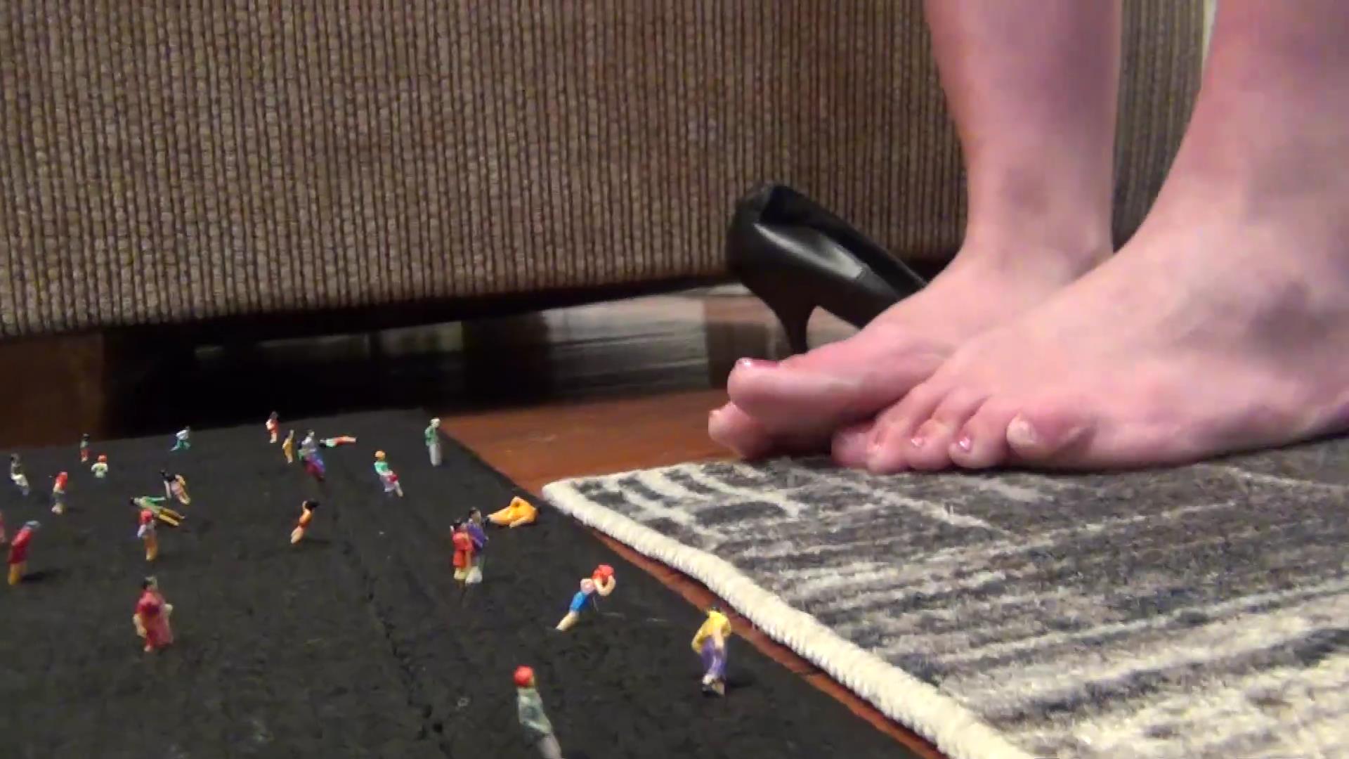 Addy is a host who is hosting a tiny man convention after a long day of her normal shift! She is uneventfully escorting a group of tiny people to their seats. She is wearing high heels but she quickly removes them and spends the remainder of the time barefoot. Addy means well but she is super clumsy and tired. She rubs her feet all over the tiny people before and after seating them.