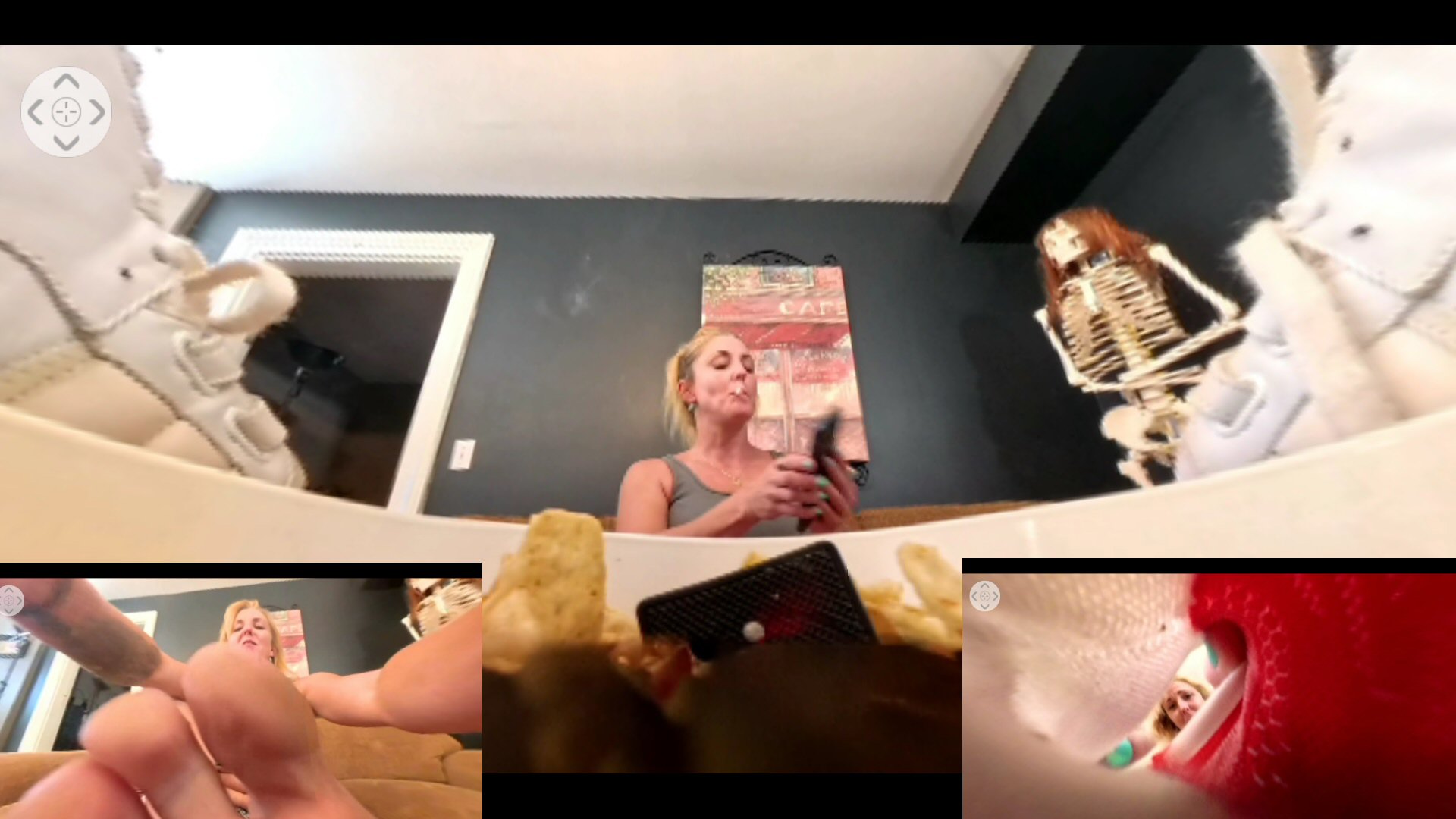 Kristen just got done with her workout as she arrives back home. She props her feet up on the table as she cools off and takes a breather. She has a bowl of chips on the table from the night before, little does she know that her perv neighbor has shrunk himself and is now in the bowl of chips just to spy on her! Kristen talks about how sore her feet are, she wishes someone was there to rub them for her! Kristen then starts snacking on some chips, the next chip she picks up she notices it looks oddly different! She gets a closer look and realizes its her neighbor! Kristen asks what has happened to him?! She has some ideas for him now since he is tiny and such a damn pervert! She starts taking off her sneakers, and places him in the middle of her sweaty stinky socks and tells him get to massaging! She then places him on the couch making him massage her tired ass which she lets out a fart! She then places him on the floor, rubbing her socked feet on him, telling him she could take him out so quick with her big socked foot! She then takes off her socks, and wants to keep him forever since he is a naughty pervert and her weird neighbor! She drops him inside one of her dirty socks as she tells him to make room for her! Kristen is going to have so much fun with her tiny pervy neighbor! MP4-VR 360